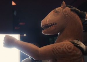 Adotando essa perspectiva, o documentário reformula o vínculo sujeito-objeto, linguagem-visual, elevando esculturas além de vestígios escavados a posturas judicantes sobre o exílio próprio, devolvendo ao público o enquadramento anterior como sentença tácita, expondo o agravo não mero na pilhagem inicial, mas na banalização e validação contínua dessa agressão originária. Esse procedimento estético aproxima o documentário de uma ótica descolonial e relativista simultaneamente, conversando sub- repticiamente com a perspectiva, propondo uma reviravolta visual onde as figuras se autopercebem humanas, enxergando humanos como caçadores, explodindo a hegemonia do agente epistêmico ocidental em um cosmos descentralizado, com o mando narrativo fugindo das instituições museológicas, guardiães e entidades estatais europeias.